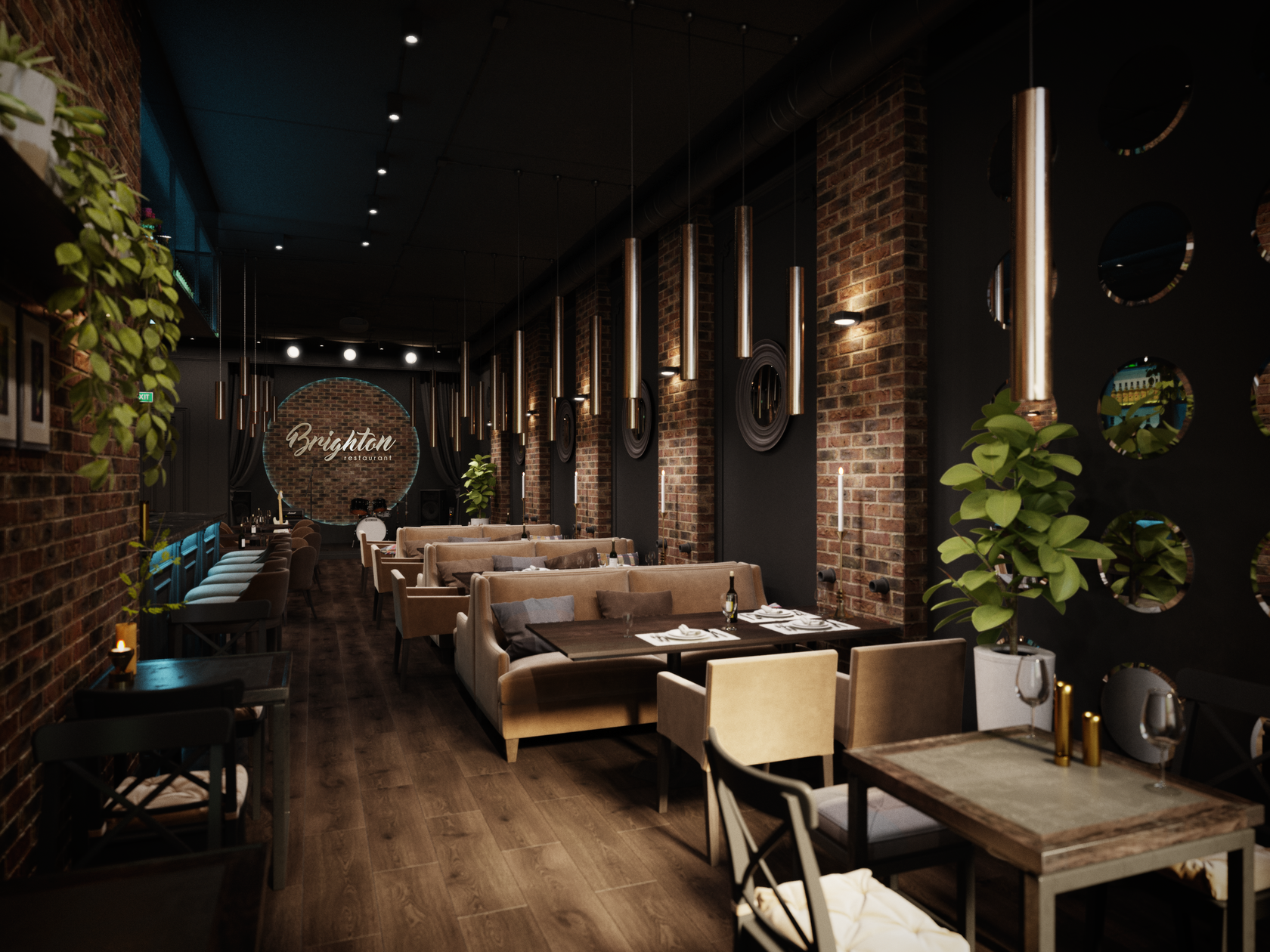 При разработке ресторана «Brighton» мы вдохновлялись архитектурой и интерьерами общественных пространств Америки 20-30х годов XX века. И пускай получившийся интерьер выглядит несколько современно, он весьма успешно передает дух той эпохи.