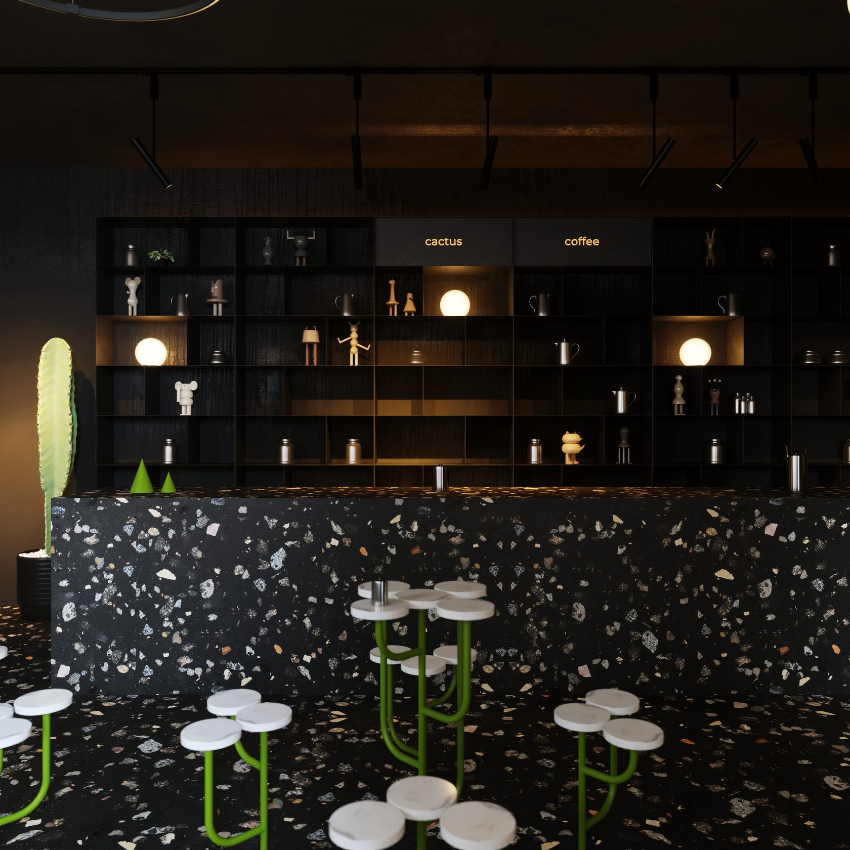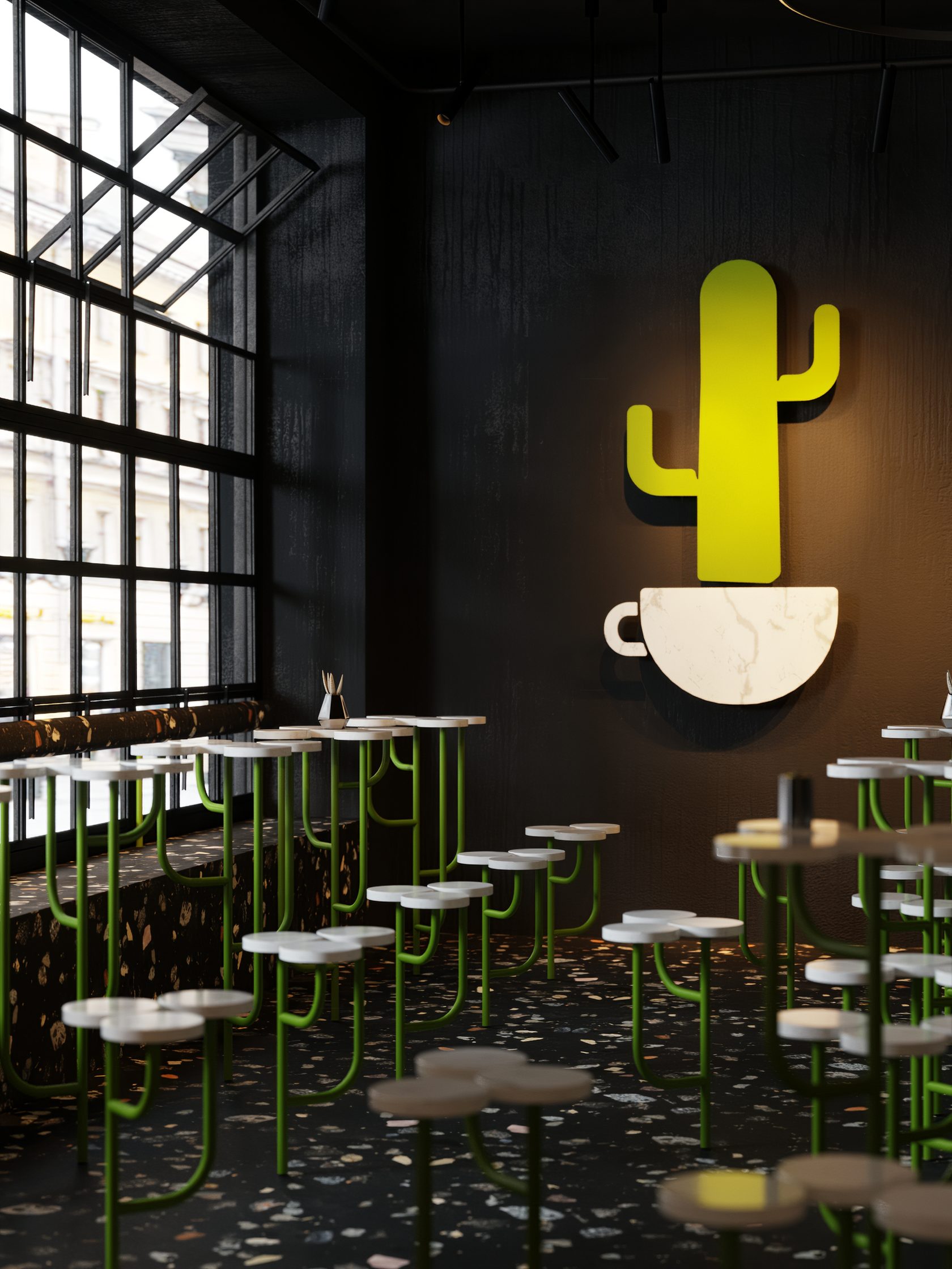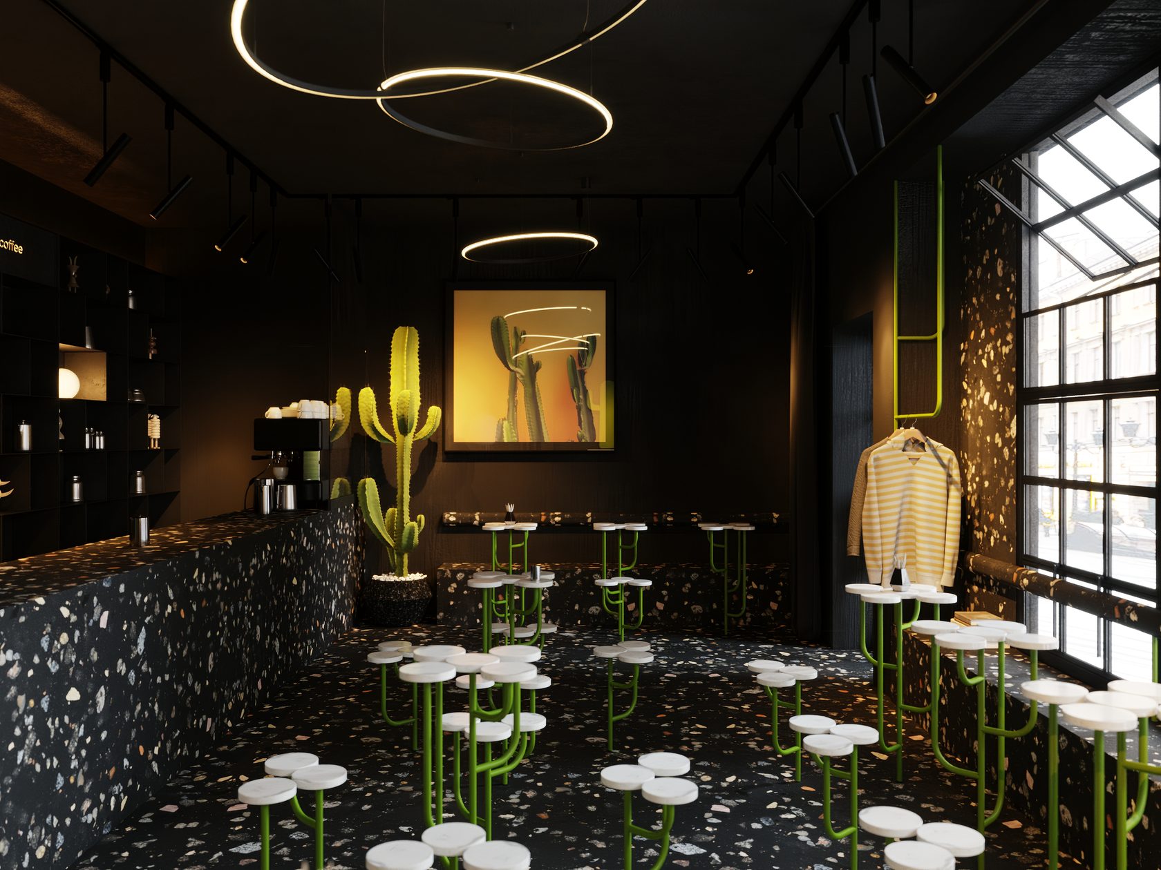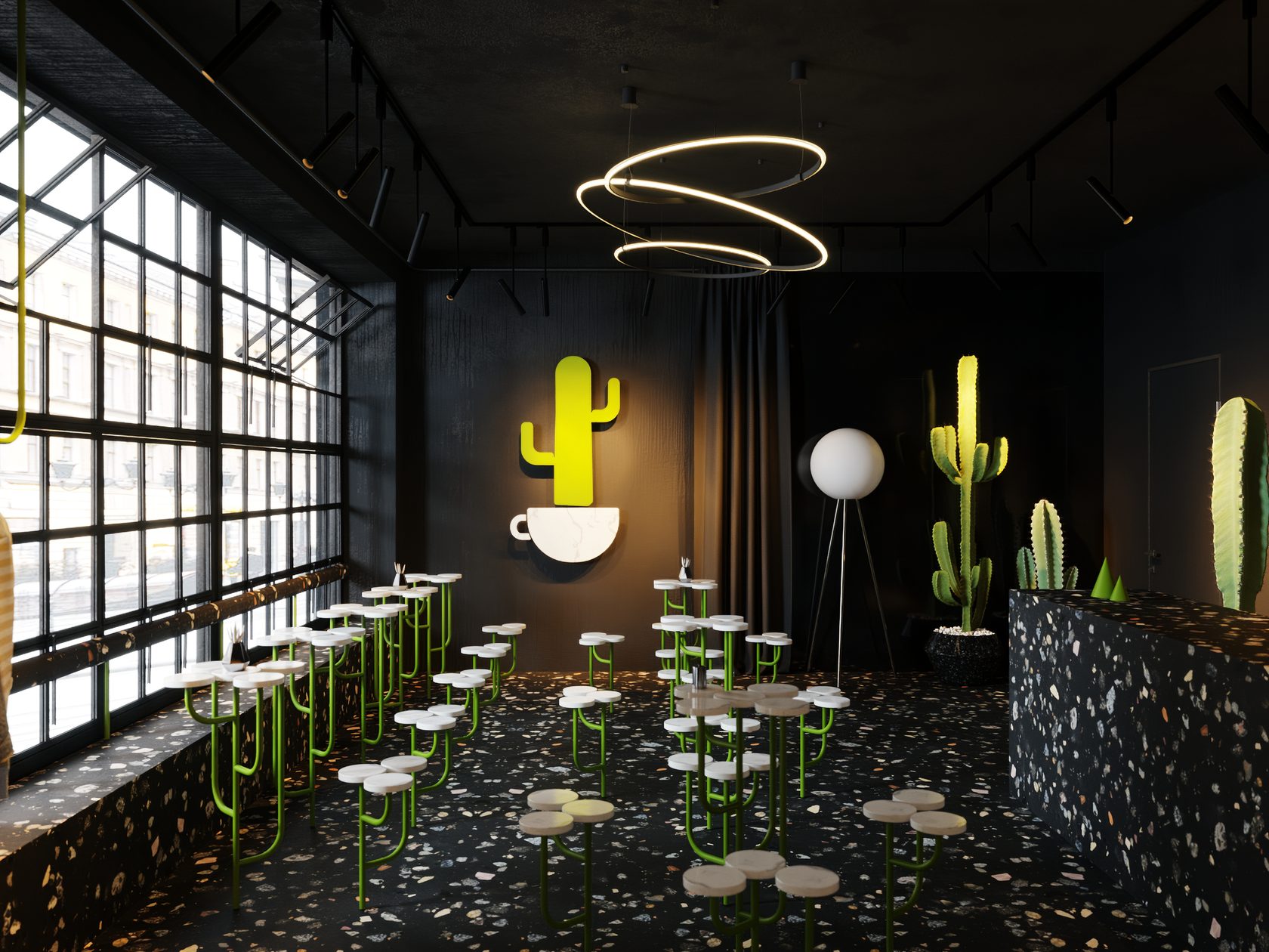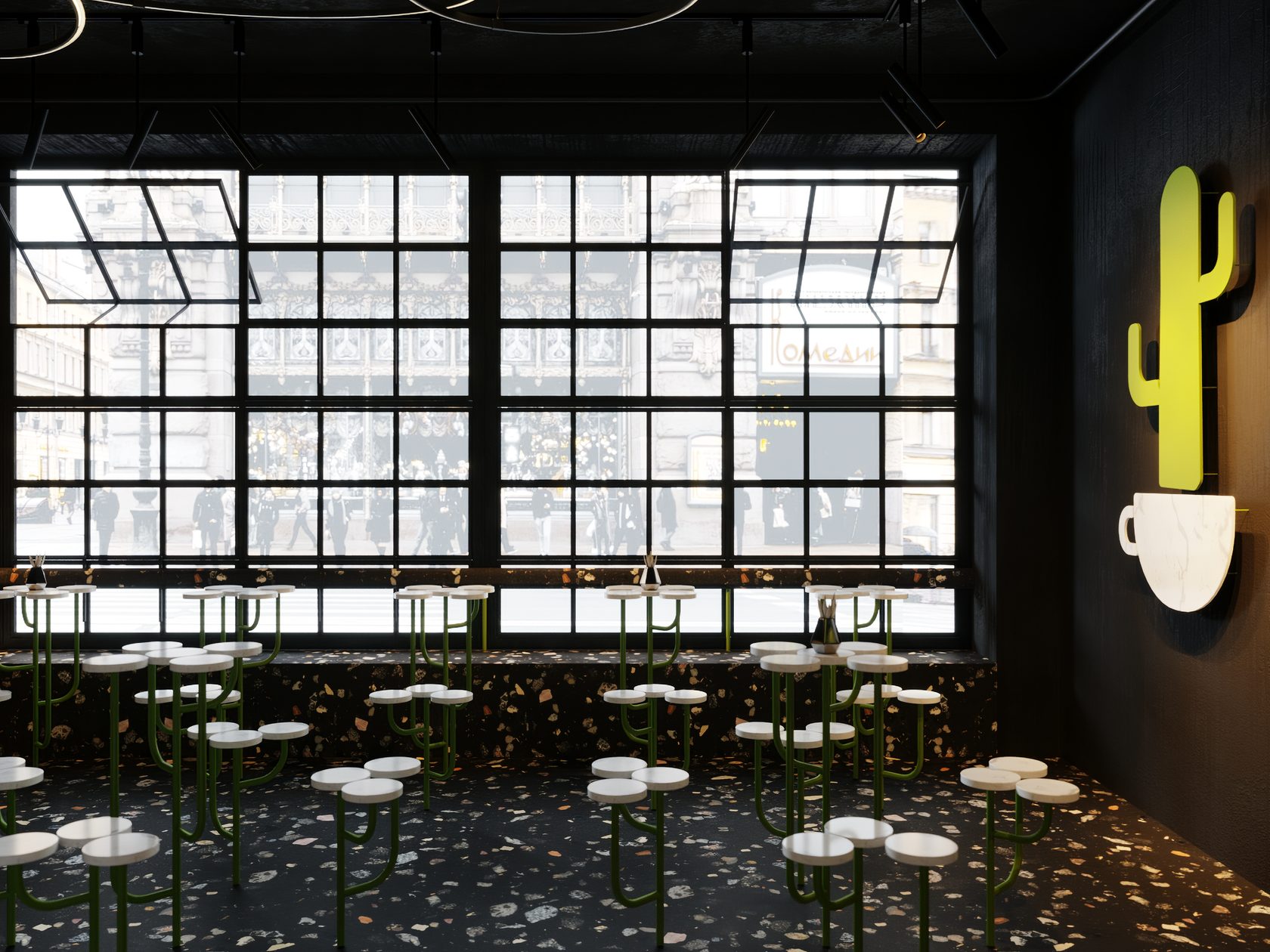 Экспериментальный проект кофейни в несуществующем месте и помещении в городе, который похож на Санкт-Петербург.