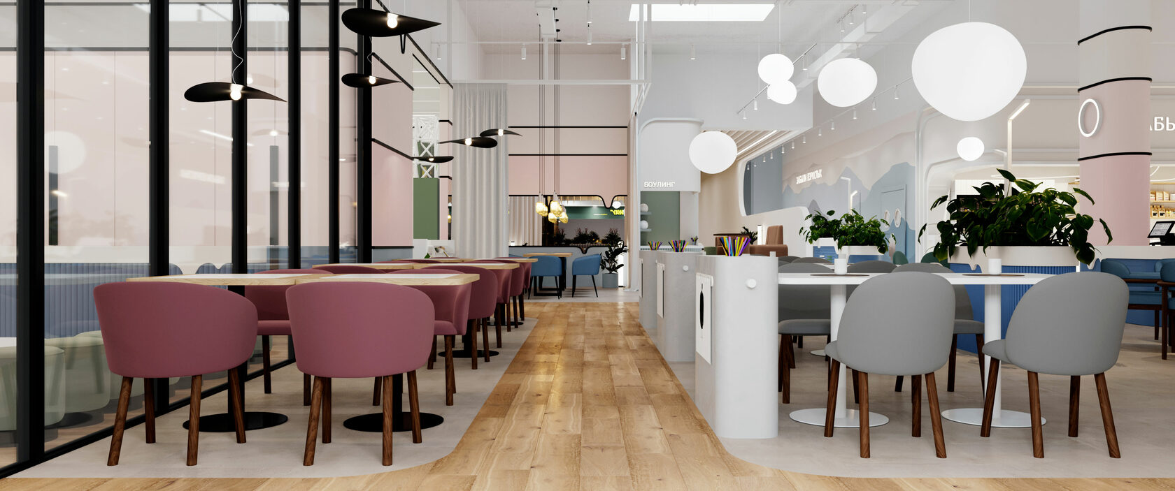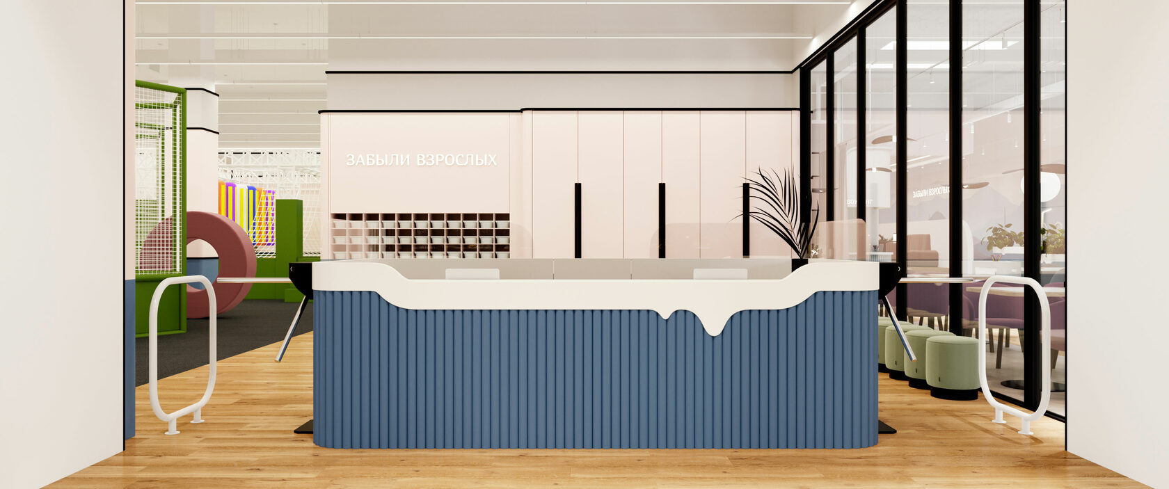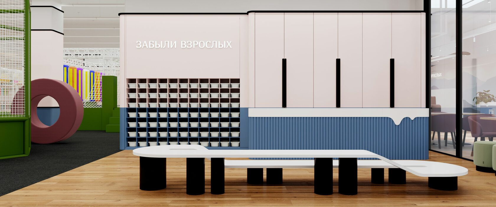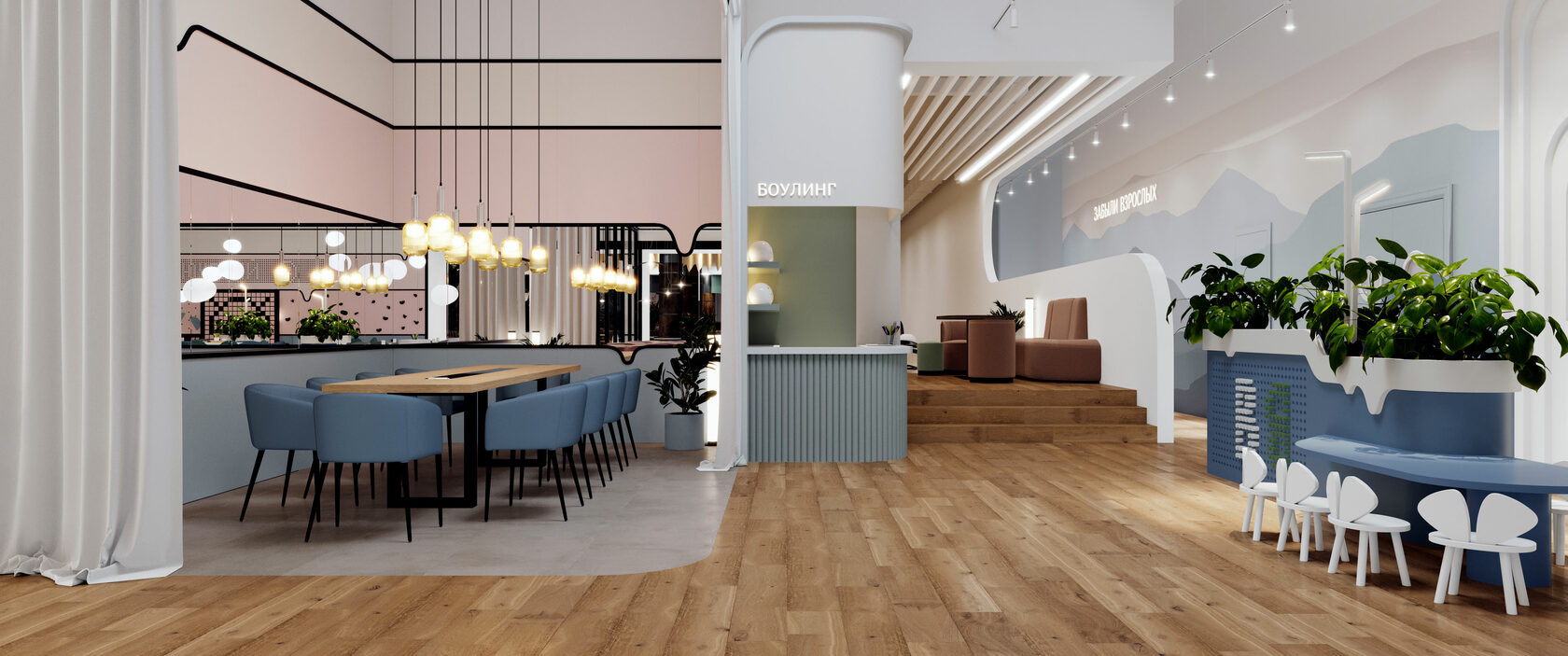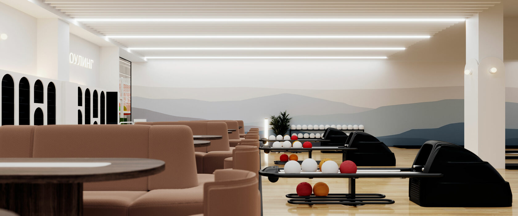 Проект детского игрового центра с боулингом в ТРЦ Гулливер. Задачей было разработать концепцию, планировочное решение и дизайн пространства, которое разделено на несколько функциональных зон: зона кафе, зона игровых аттракционов, зона игровых автоматов и зона боулинга.