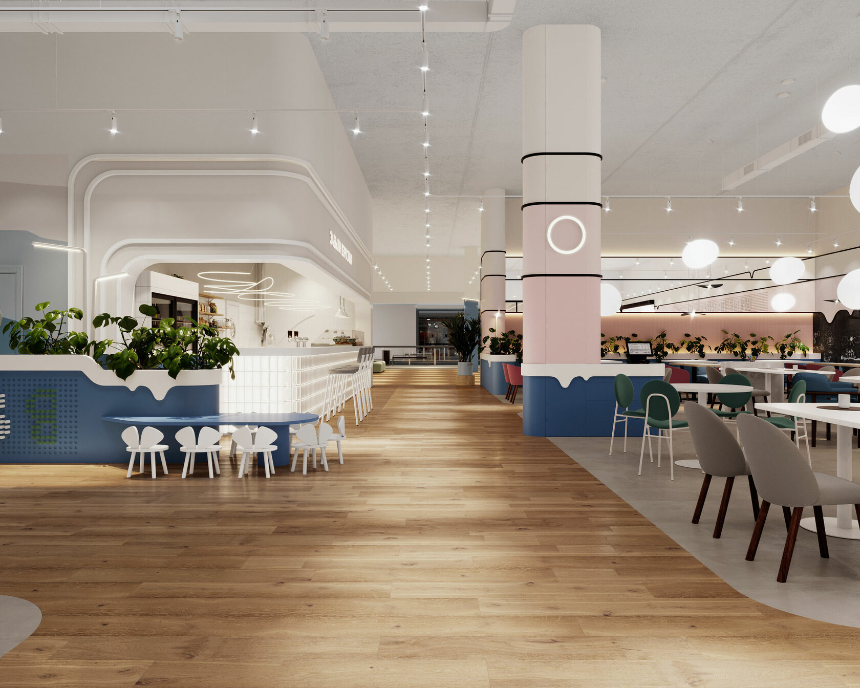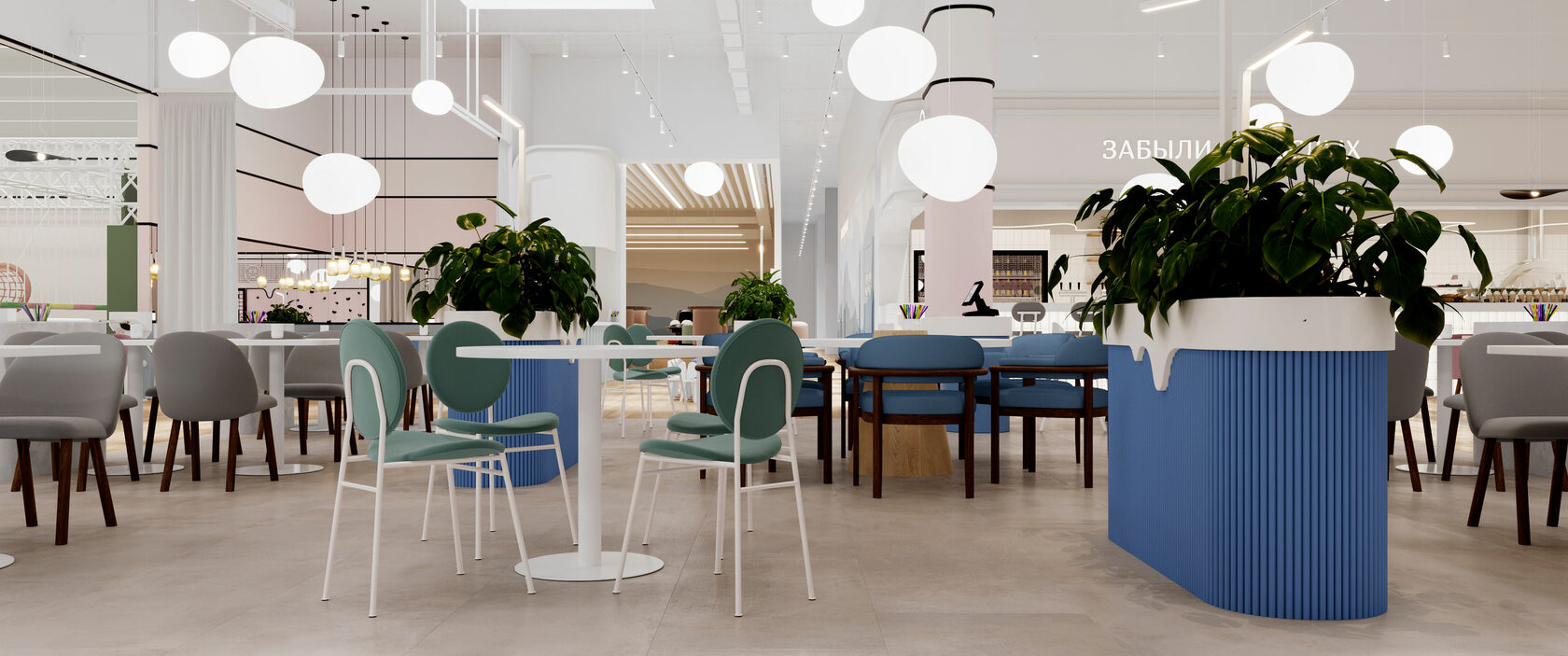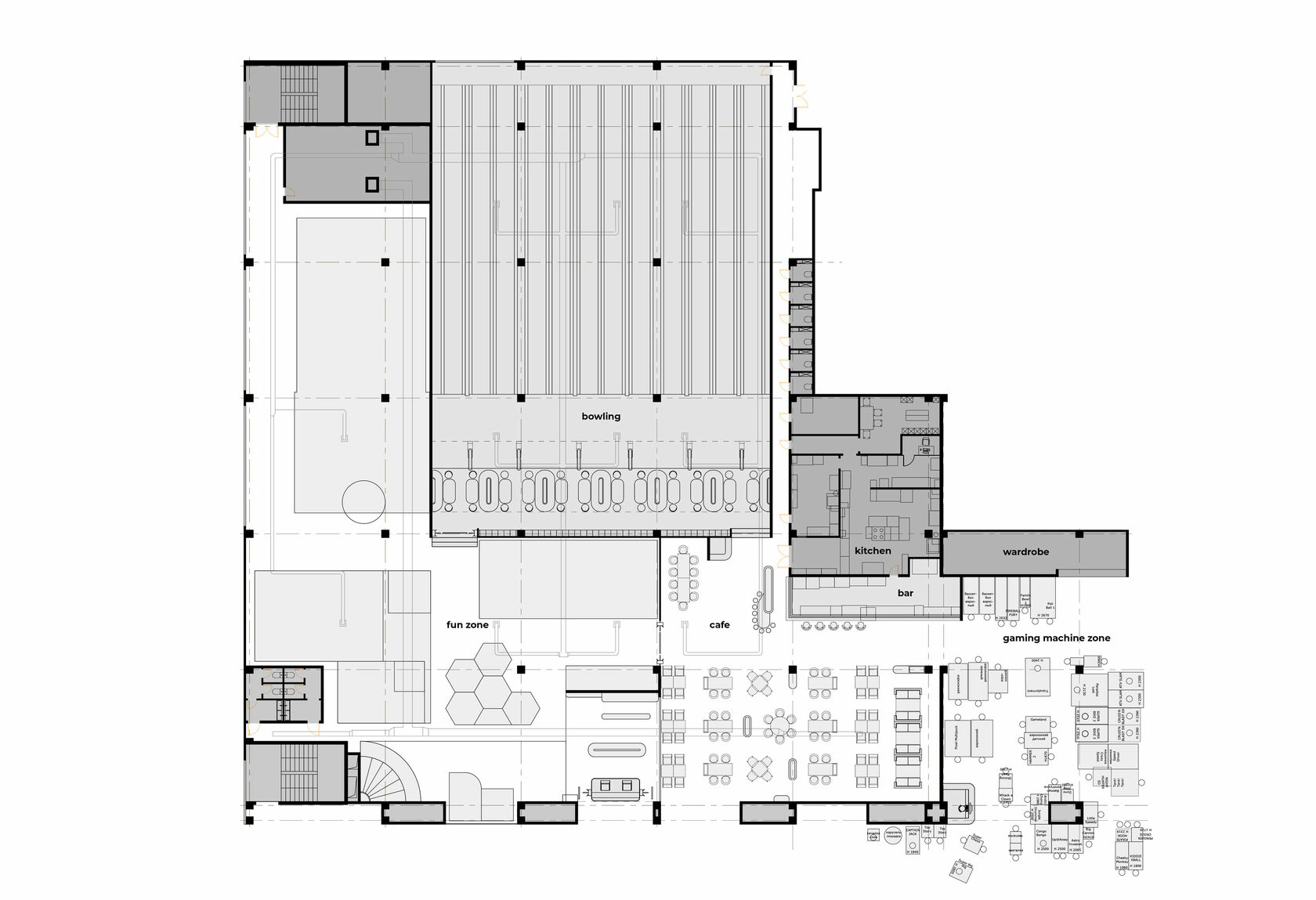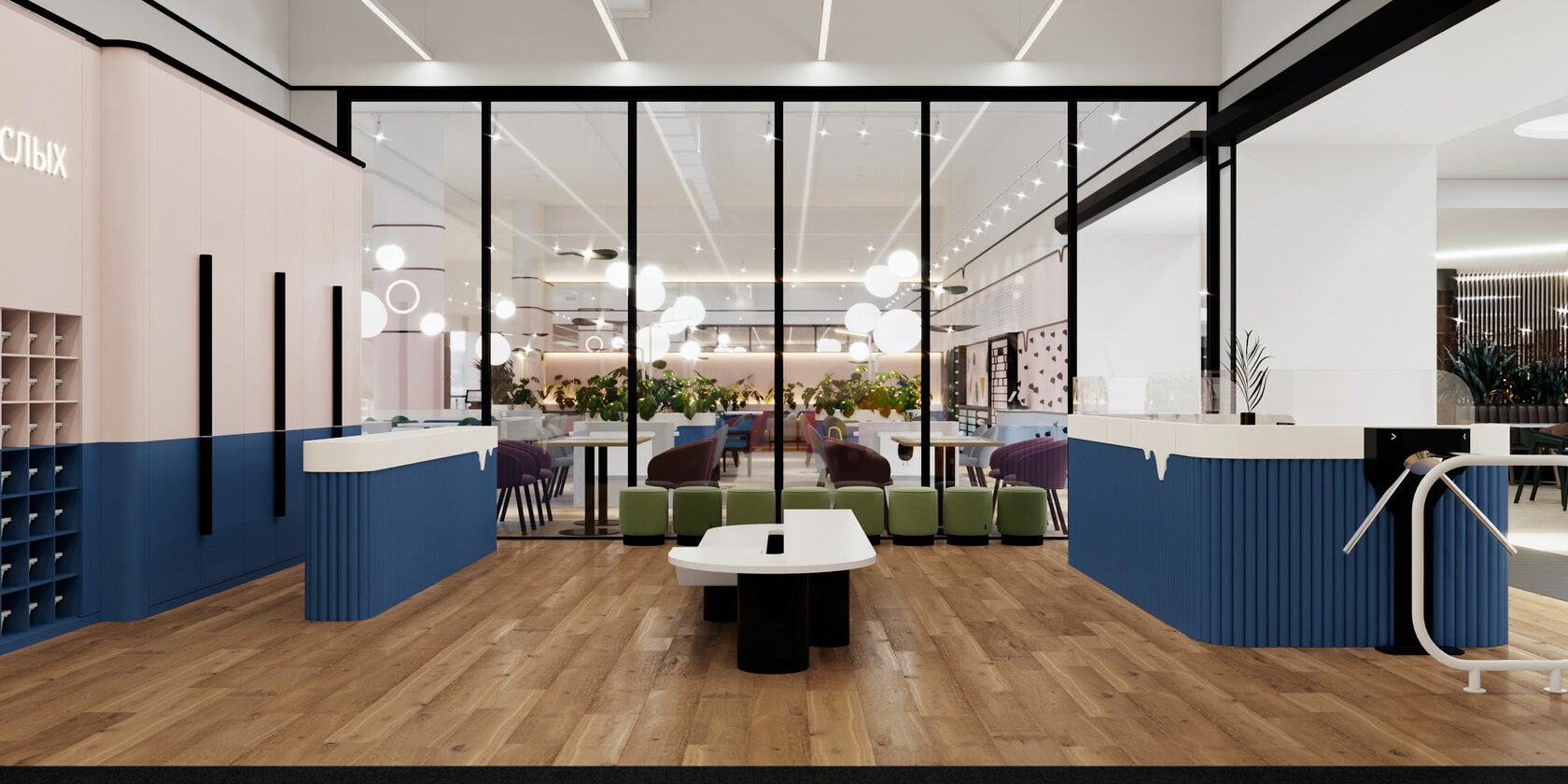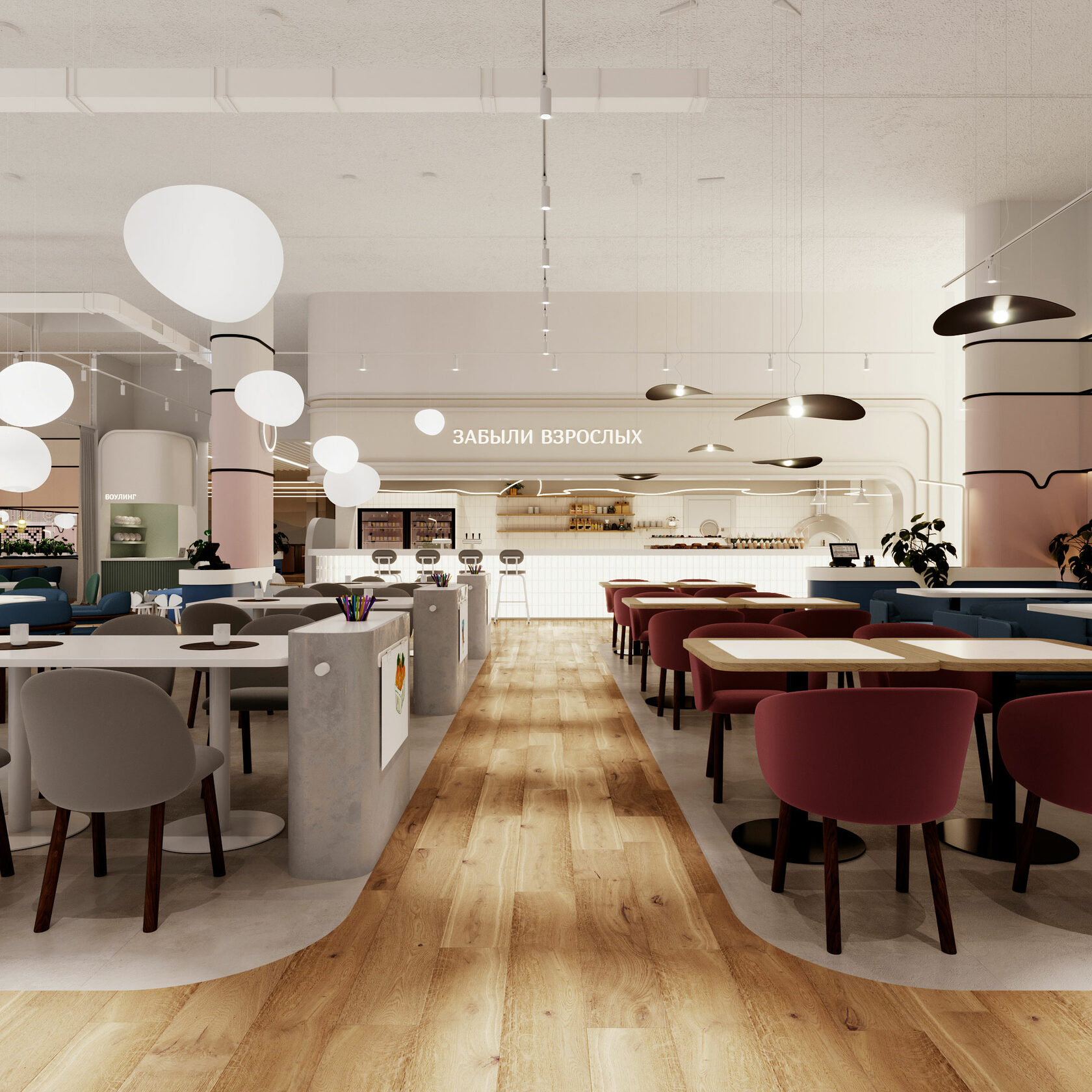 Проект детского игрового центра с боулингом в ТРЦ Гулливер. Задачей было разработать концепцию, планировочное решение и дизайн пространства, которое разделено на несколько функциональных зон: зона кафе, зона игровых аттракционов, зона игровых автоматов и зона боулинга.